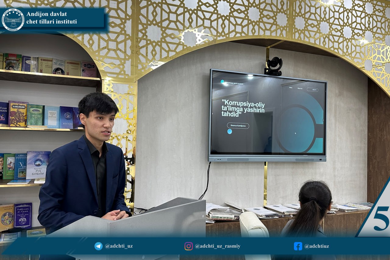 Andijon davlat chet tillari institutining talaba-yoshlari oʼrtasida korrupsiyaga qarshi kurashish tizimi samaradorligini oshirish maqsadida, Korrupsiyaga qarshi kurashish «Komplaens» nazorati hamda Iqtidorli talabalarning ilmiy-tadqiqot faoliyatini tashkil etish boʼlimlari hamkorligida «Korrupsiya-oliy taʼlimga yashirin tahdid» shiori ostida loyihalar tanlovi tashkil etildi.