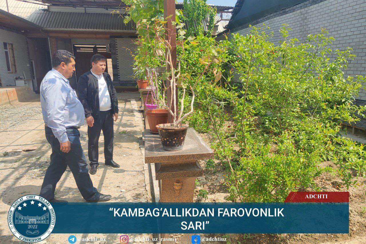 Jumladan, Andijon davlat chet tillari instituti ham ushbu jarayonda ishtirok etib, Buloqboshi tumani Neftchilar MFYda joylashgan xonadonlarda istiqomat qiluvchi aholi bilan uchrashib, ularga «Kambag’allikdan farovon hayot sari» dasturi maqsad va g’oyalari haqida tushunchalar bermoqda.