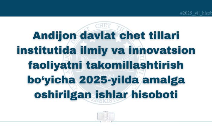 Andijon davlat chet tillari institutining bir guruh iqtidorli doktorantlari yakunlanayotgan hafta davomida Qirgʻiziston Respublikasining yetakchi oliy taʼlim muassasalarida ilmiy-stajirovka o‘tadilar. Ushbu tashrif institutning xalqaro ilmiy aloqalarini yanada mustahkamlash, yosh olimlarning ilmiy salohiyatini oshirish hamda xorijiy tajribani o‘rganish maqsadida tashkil etildi.