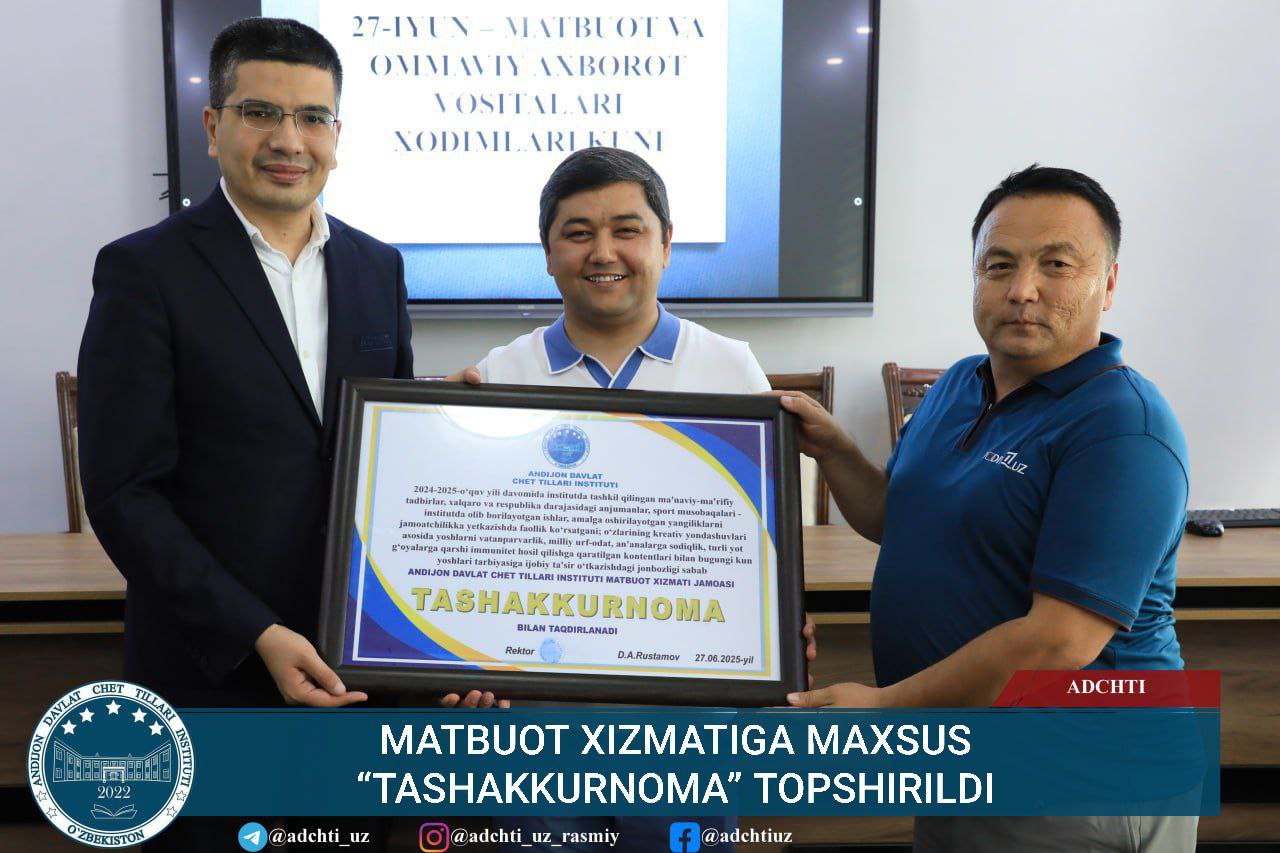 INSTITUT MATBUOT XIZMATIGA MAXSUS “TASHAKKURNOMA” TOPSHIRILDI