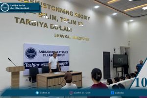 Andijon davlat chet tillari instituti Ingliz tili va adabiyoti fakultetida “Dolzarb 90 kunlik” loyihasi doirasida 1-bosqich talabalari bilan uchrashuv tashkil etildi. Uchrashuvda fakultet dekani K.Karimov ishtirok etib, talaba-yoshlar bilan ochiq muloqot olib bordi.