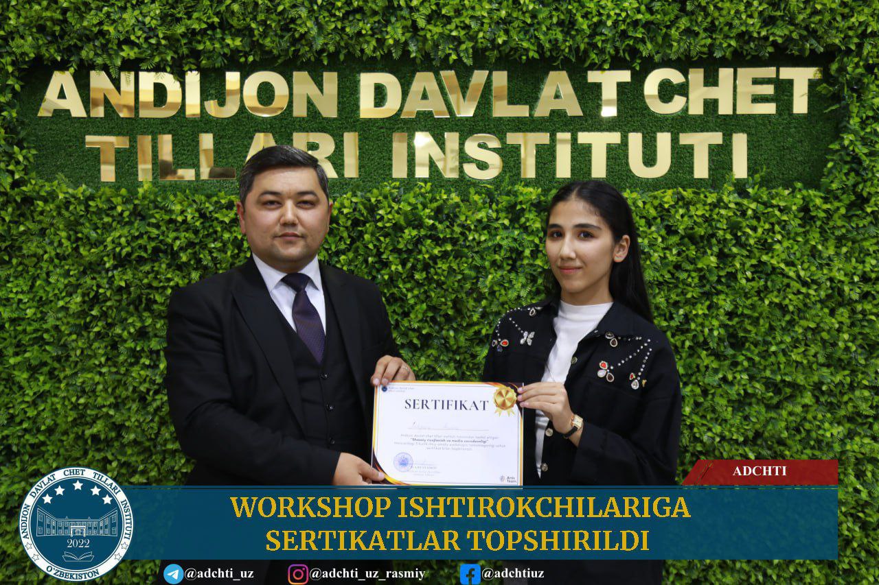 Workshop yakunida barcha ishtirokchilarga Andijon davlat chet tillari instituti rektori Dilshodbek Abduvahidovich Rustamov tomonidan imzolangan maxsus sertifikatlar tantanali ravishda topshirildi.