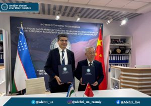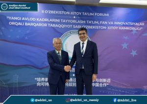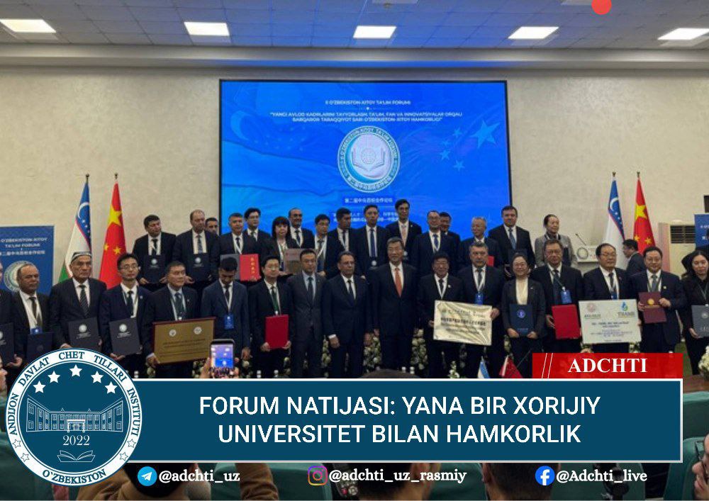 Bugun Toshkent shahrida o‘tkazilgan O‘zbekiston–Xitoy ikkinchi ta’lim forumida Andijon davlat chet tillari instituti rektori, professor Dilshodbek Abduvahidovich Rustamov ham faol ishtirok etdi. Forumning ikkinchi qismida institut va Xitoy Xalq Respublikasining Kashi universiteti o‘rtasida xalqaro hamkorlik bo‘yicha shartnoma imzolandi.