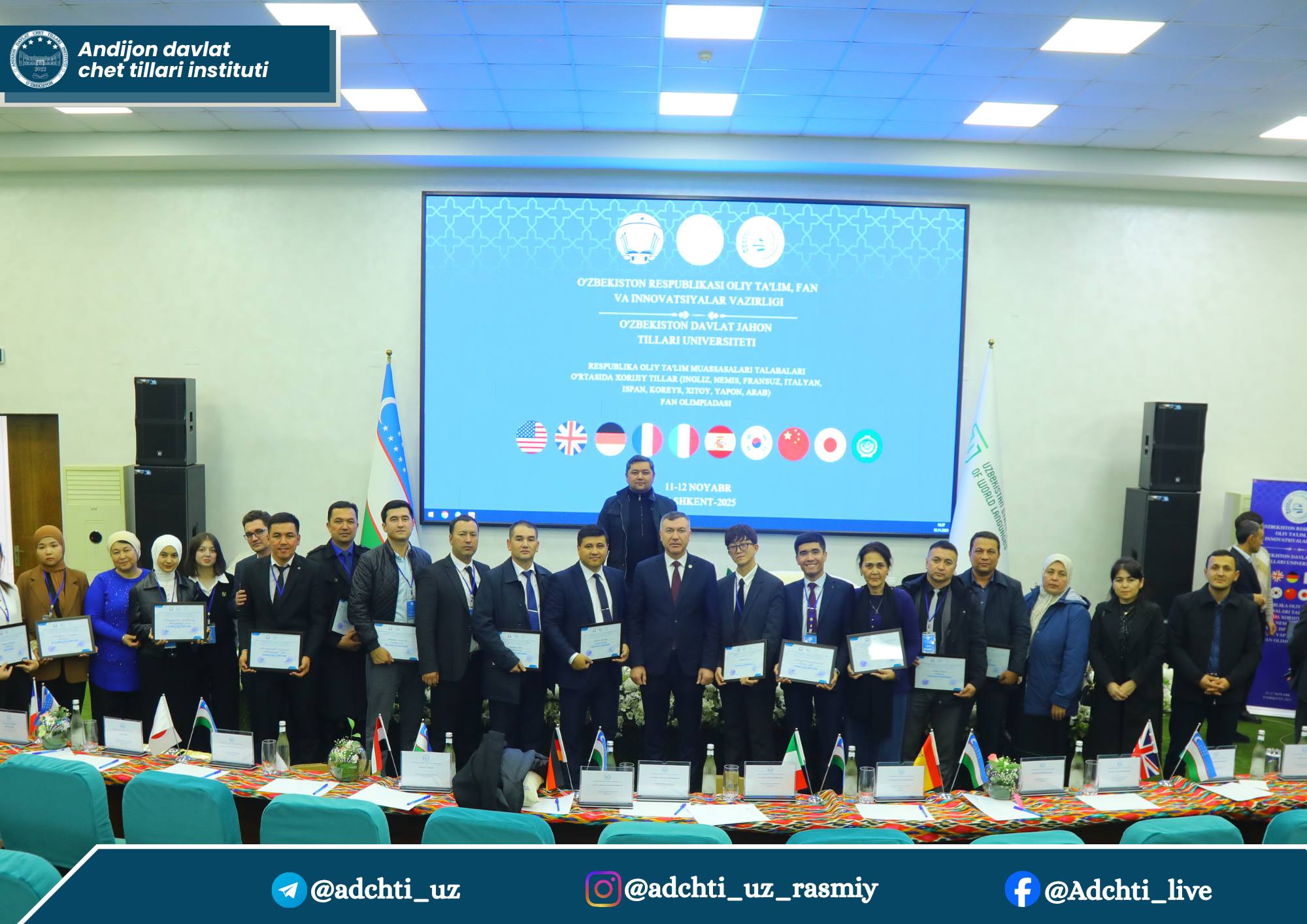Joriy yilning 11–12-noyabr kunlari O‘zbekiston davlat jahon tillari universitetida mamlakatimizdagi 43 ta oliy ta’lim muassasalari talabalari o‘rtasida 9 ta xorijiy tilda fan olimpiadasi bo‘lib o‘tdi. Unda Andijon davlat chet tillari instituti talabalari ham ingliz, nemis, fransuz, xitoy, yapon, koreys va arab tillari yo‘nalishlarida faol ishtirok etdilar.