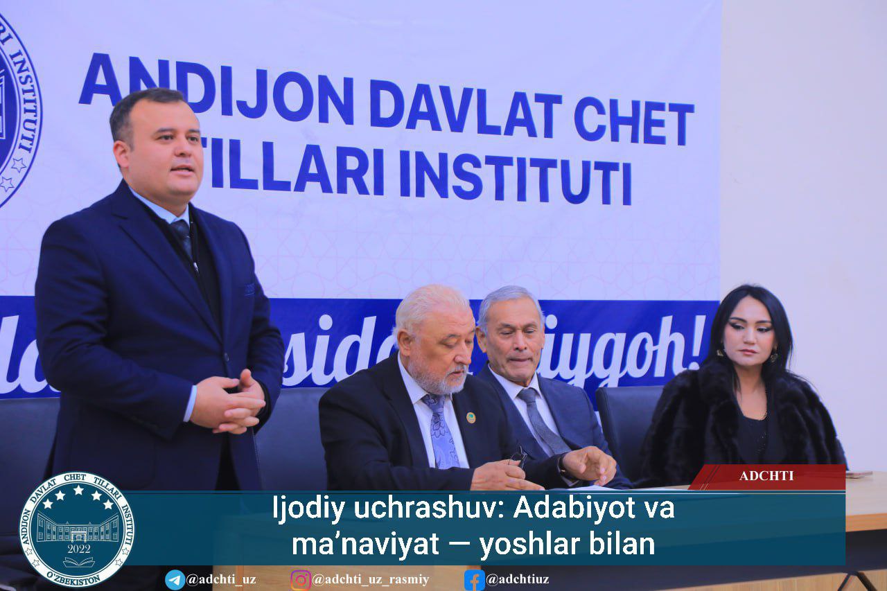 Andijon davlat chet tillari institutida talaba-yoshlar ishtirokida yirik adabiy-ma’rifiy uchrashuv bo‘lib o‘tdi. Tadbirda O‘zbekiston Respublikasi Xalqaro adabiyot, san’at, madaniyat va ijtimoiy fanlar akademiyasi rahbari, “Abdulla Vaxsh” taxallusi bilan tanilgan Abdulla Axmatovich Mengqobilov, shoira “Shaxloxon” taxallusi bilan mashhur Shaxlo Abdulxakimovna, adabiyotshunos olim, filologiya fanlari doktori, professor Sobirov Abdulhay Shukurovichlar ishtirok etdilar.