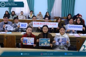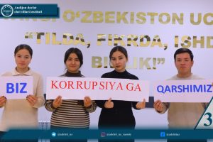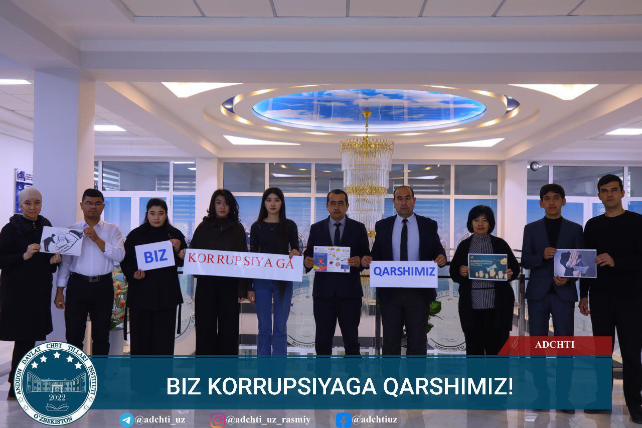 Andijon davlat chet tillari instituti Korrupsiyaga qarshi «Komplaens-nazorat» tizimini boshqarish bo’limi hamda Roman-german va slavyan tillari fakulteti tomonidan 9-dekabr — Xalqaro korrupsiyaga qarshi kurash kuni munosabati bilan rahbar va ishchi xodimlar, professor-o’qituvchilar, tyutorlar hamda talaba-yoshlar o’rtasida #biz_korrupsiyaga_qarshimiz heshtegi ostida fleshmob tashkil qilindi.