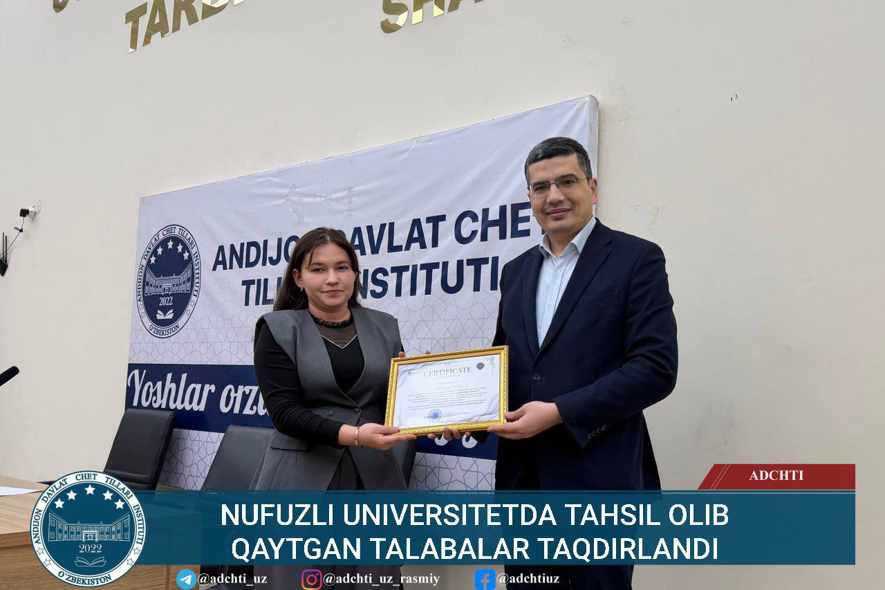 Andijon davlat chet tillari instituti xalqaro aloqalarni mustahkamlash va talabalarning dunyo miqyosida raqobatbardosh kadr bo‘lib yetishishini ta’minlash borasida navbatdagi amaliy natijani qayd etdi.