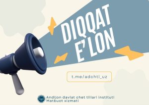 ADCHTI huzuridagi ilmiy darajalar beruvchi DSc.03/2025.27.12.Fil.32.02 raqamli Ilmiy Kengash qoshidagi Ilmiy seminarning navbatdagi dissertatsiya ishlari muhokamasi 2026-yil 7-aprel kuni soat 10:00 va 12.00 da Andijon davlat chet tillari instituti «C» binosi 1-qavat 102c-xonada offline va onlayn (ZOOM dasturida) bo‘lib o‘tadi.