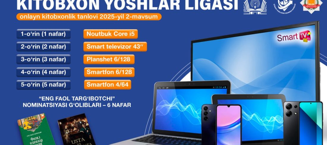 Talaba va oʻquvchilar oʻrtasida oʻtkaziladigan “Kitobxon yoshlar ligasi” onlayn kitobxonlik tanlovi 2025-yil 2-mavsumi NIZOMI I. Umumiy qoidalar 1.1. Mazkur nizom talaba va oʻquvchilar oʻrtasida “Kitobxon yoshlar ligasi” onlayn kitobxonlik tanlovini (keyingi oʻrinlarda Tanlov deb yuritiladi) oʻtkazish tartibini belgilaydi. 1.2. Ushbu Tanlov Oliy taʼlim, fan...Read More