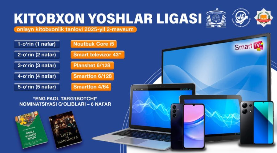 Talaba va oʻquvchilar oʻrtasida oʻtkaziladigan “Kitobxon yoshlar ligasi” onlayn kitobxonlik tanlovi 2025-yil 2-mavsumi NIZOMI I. Umumiy qoidalar 1.1. Mazkur nizom talaba va oʻquvchilar oʻrtasida “Kitobxon yoshlar ligasi” onlayn kitobxonlik tanlovini (keyingi oʻrinlarda Tanlov deb yuritiladi) oʻtkazish tartibini belgilaydi. 1.2. Ushbu Tanlov Oliy taʼlim, fan va innovatsiyalar vazirligi huzuridagi Talaba va oʻquvchilarning ijtimoiy faolligini oshirish markazi tomonidan tashkil etiladi. 1.3. Tanlovda Respublikamizdagi barcha (davlat, xorijiy, xususiy) oliy taʼlim muassasalarining bakalavriat...